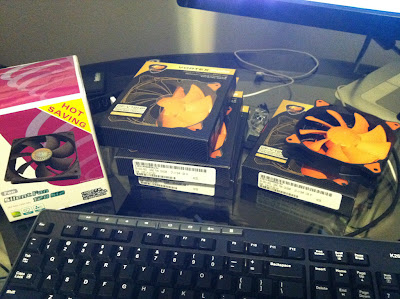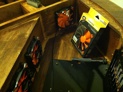 Installed fans! The three in the center pull air in, the two on the sides & PSU push air out.