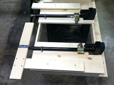 Heavy-duty linear guide rails 22" extension, next to a fully extended actuator arm. The idea is the actuator arms hold the load, the guide rails keep the legs in line. Together, they should keep the desk from rocking to much.